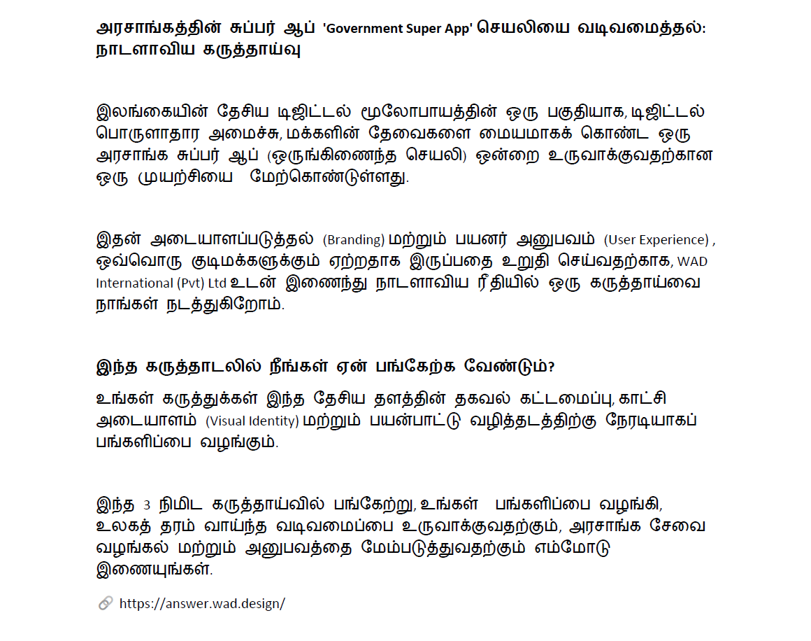 3 நிமிட கருத்தாய்வில் பங்கேற்க எம்மோடு இணையுங்கள் :https://answer.wad.design/