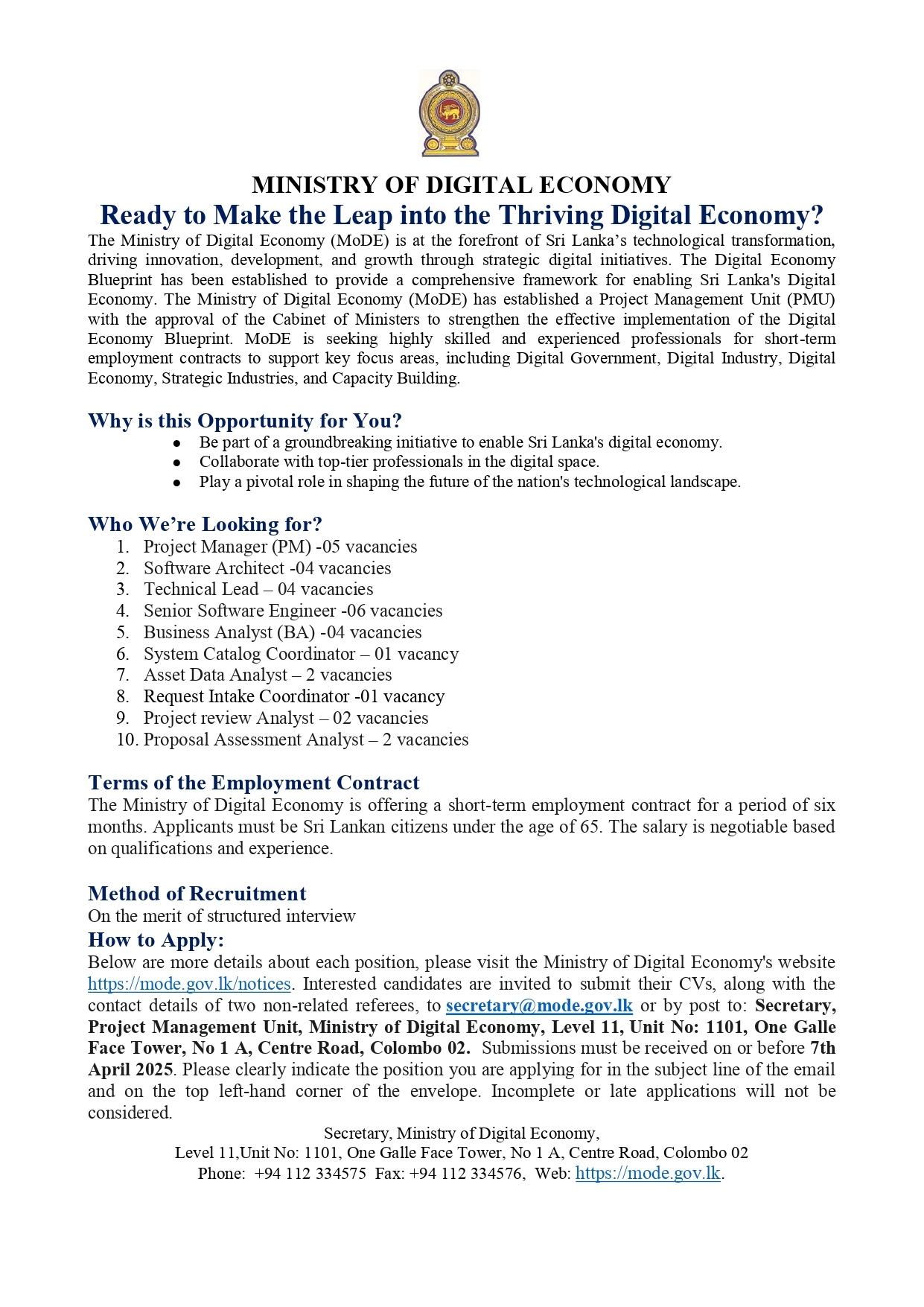 • Postal Address: Ministry of Technology, Level 11, One Galle Face Tower, No. 1A. Centre Road, Galle Face, Colombo 02.