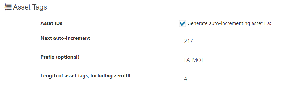 For users who don't need asset labels, the unique serial number of each device is often used as the asset tag, or you can turn on auto-incrementing asset tags in Admin > Settings, which will generate a unique asset tag for you when you create new assets.